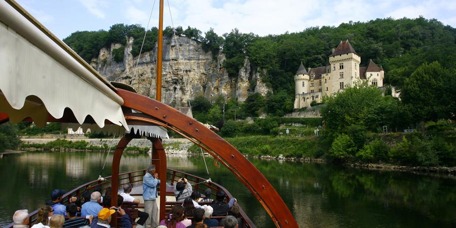 In medieval times La Roque-Gageac's location on the Dordogne River assured the village's prosperity as a busy trading port. Goods were transported along the river in traditional flat-bottomed boats called 'Gabares'. Today, visitors can take a river cruise in replicas of these trading vessels, and this provides an exceptional view of La Roque-Gageac, particularly in the mid-to-late afternoon when the lowering sun beautifully illuminates the village's honey-coloured buildings.