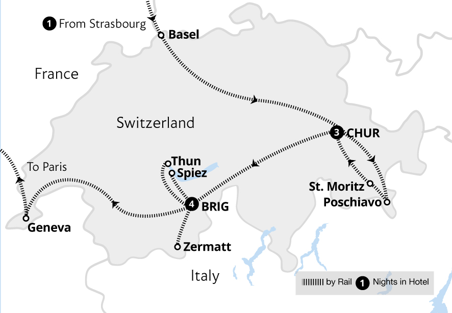 Experience epic mountain landscapes and shimmering alpine lakes on this fantastic holiday to Switzerland. Discover the Swiss Alps on the world-acclaimed Bernina Express and Glacier Express from our popular bases in Chur and Brig, traditional towns surrounded by snow-capped peaks. Enjoy a private aperitif on the terrace of the 10th-century ...