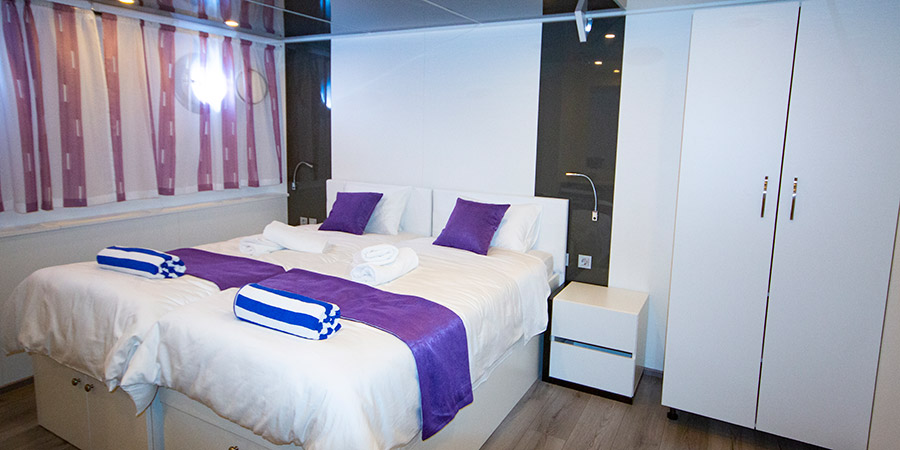 - Cabins feature air-conditioning, a safe, an audio system, a wardrobe, desk, sofa, and porthole window. En-suite bathrooms include a shower and a hairdryer and beds can be configured to twins or a double.