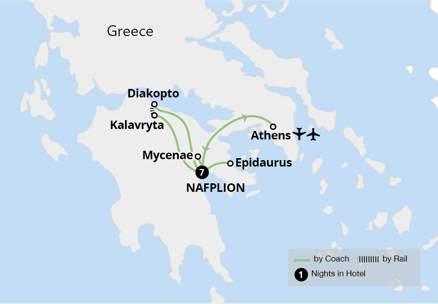 Your Greek holiday begins at London Heathrow, where you meet the Tour Manager and the rest of our group before boarding a flight to Athens. On arrival at the Greek capital, we transfer by coach to our hotel on the outskirts of the historic Venetian city of Nafplion, set on the north-eastern Peloponnese coast. Our journey takes around two hours from Athens, and along the way we cross the impressive Corinth canal.
