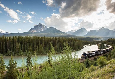 Famous for its stunning views of the mountains near Lake Louise, Morant's Curve is one of the most iconic and picturesque locations in the Canadian Rockies. The dramatic bend along the Bow River is a photographer's dream, offering the perfect shot of Rocky Mountaineer as its winds gracefully through the spectacular alpine scenery.